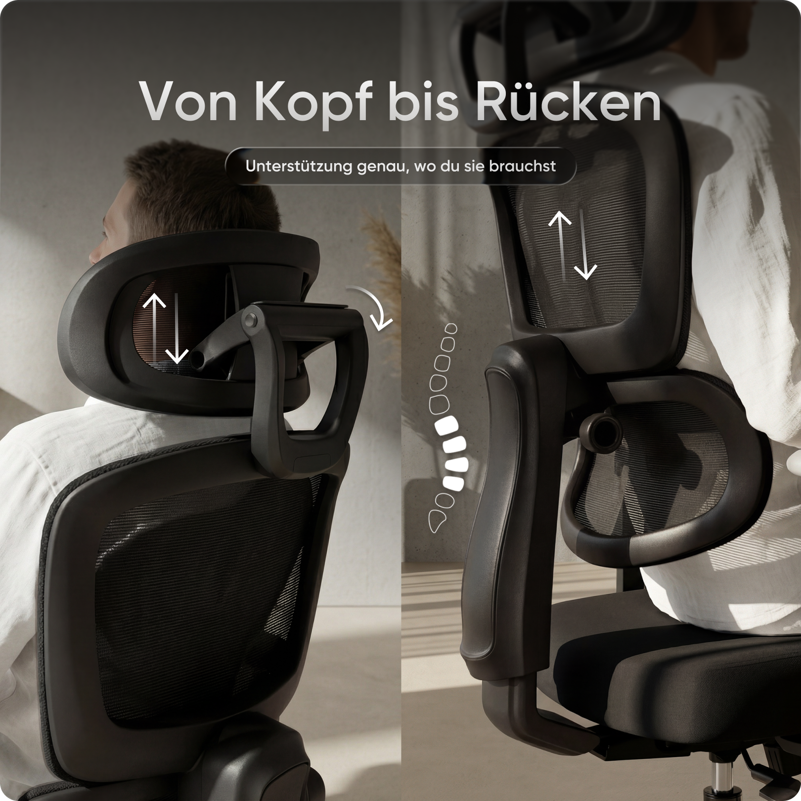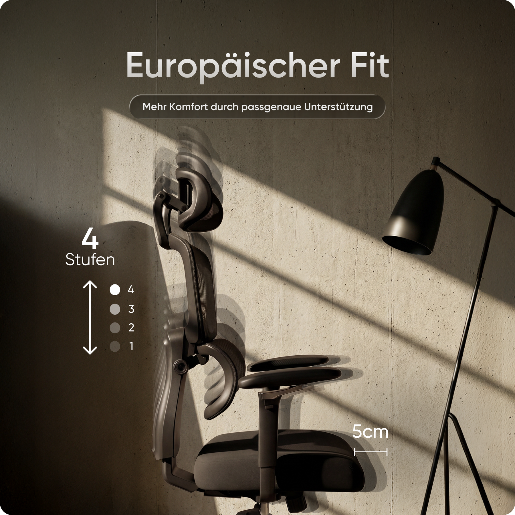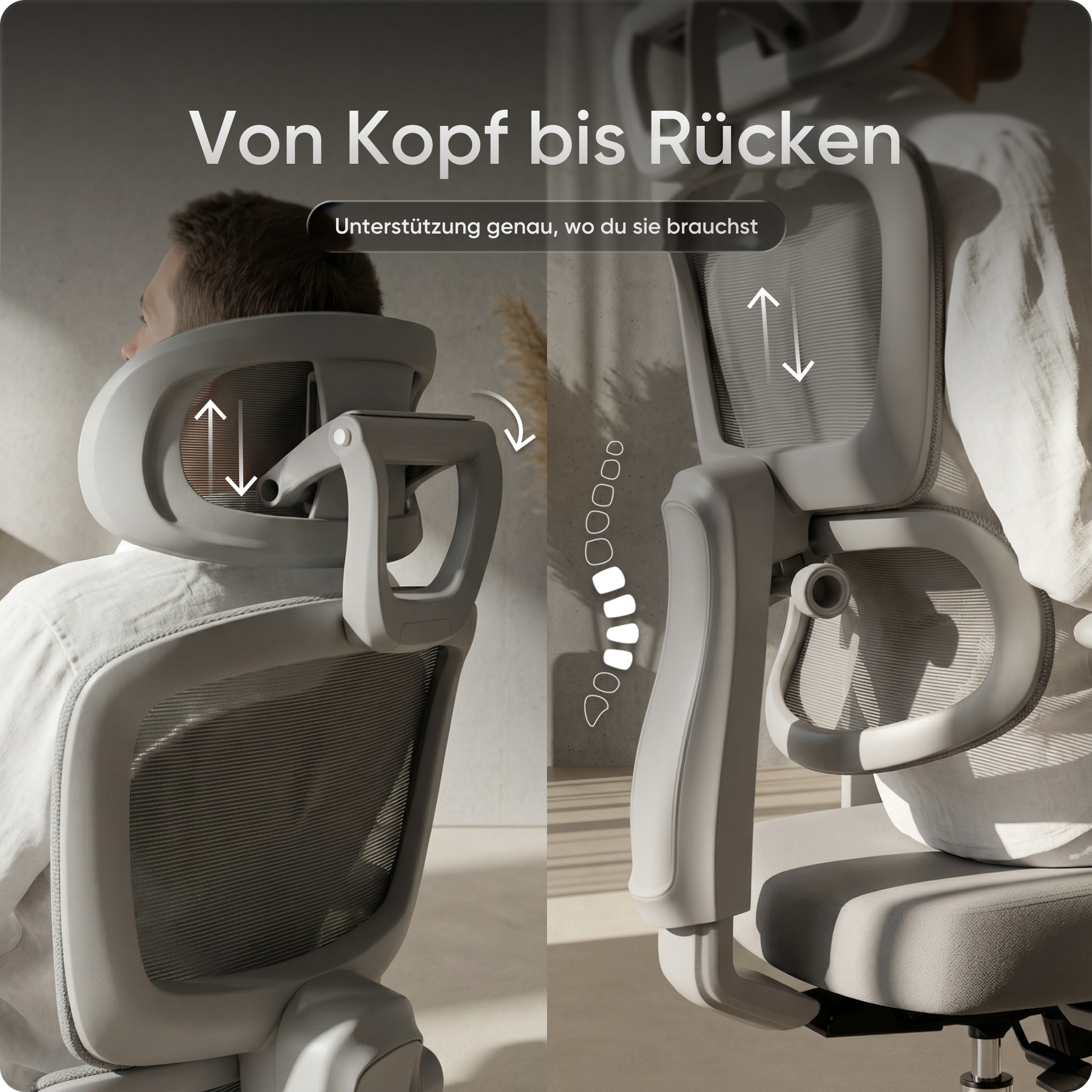 Die 3-Zonen-Lordosenstütze passt sich präzise an deinen Rücken an und fördert eine gesunde Haltung. Die Rückenlehne lässt sich in vier Stufen auf deine Größe einstellen und bietet stabilen Halt. Die doppelt schwenkbare Kopfstütze entlastet Nacken und Schultern.
