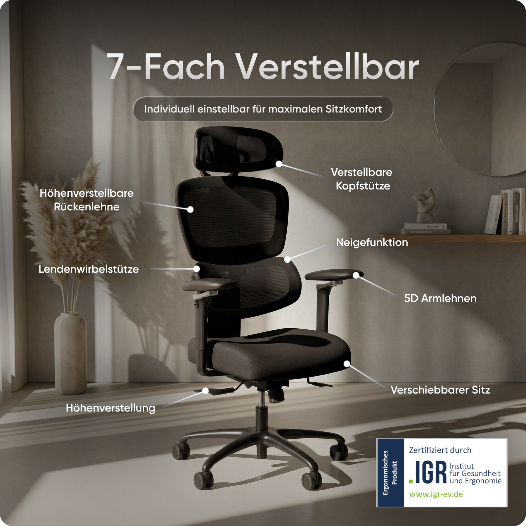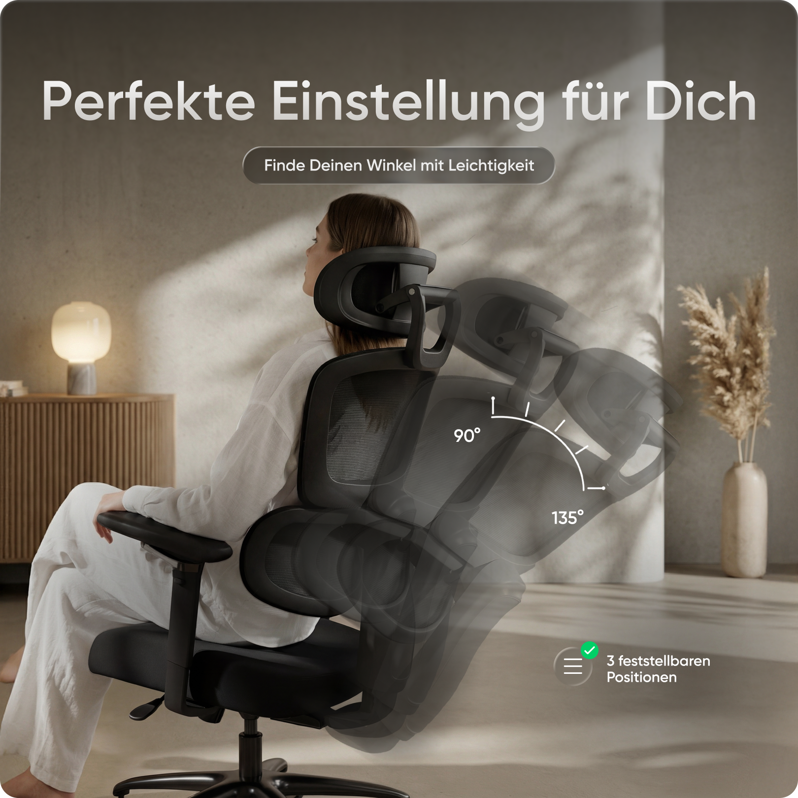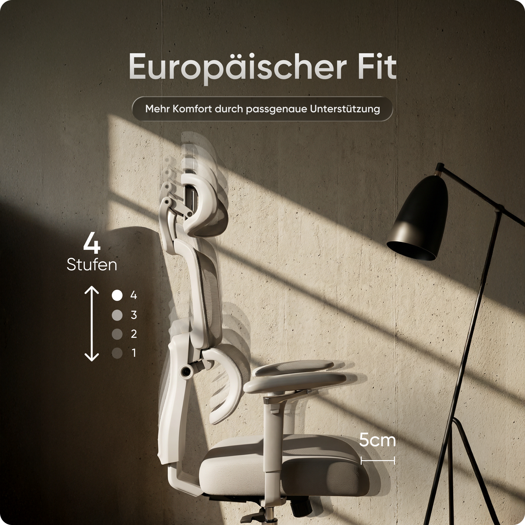 Die 3-Zonen-Lordosenstütze passt sich präzise an deinen Rücken an und fördert eine gesunde Haltung. Die Rückenlehne lässt sich in vier Stufen auf deine Größe einstellen und bietet stabilen Halt. Die doppelt schwenkbare Kopfstütze entlastet Nacken und Schultern.