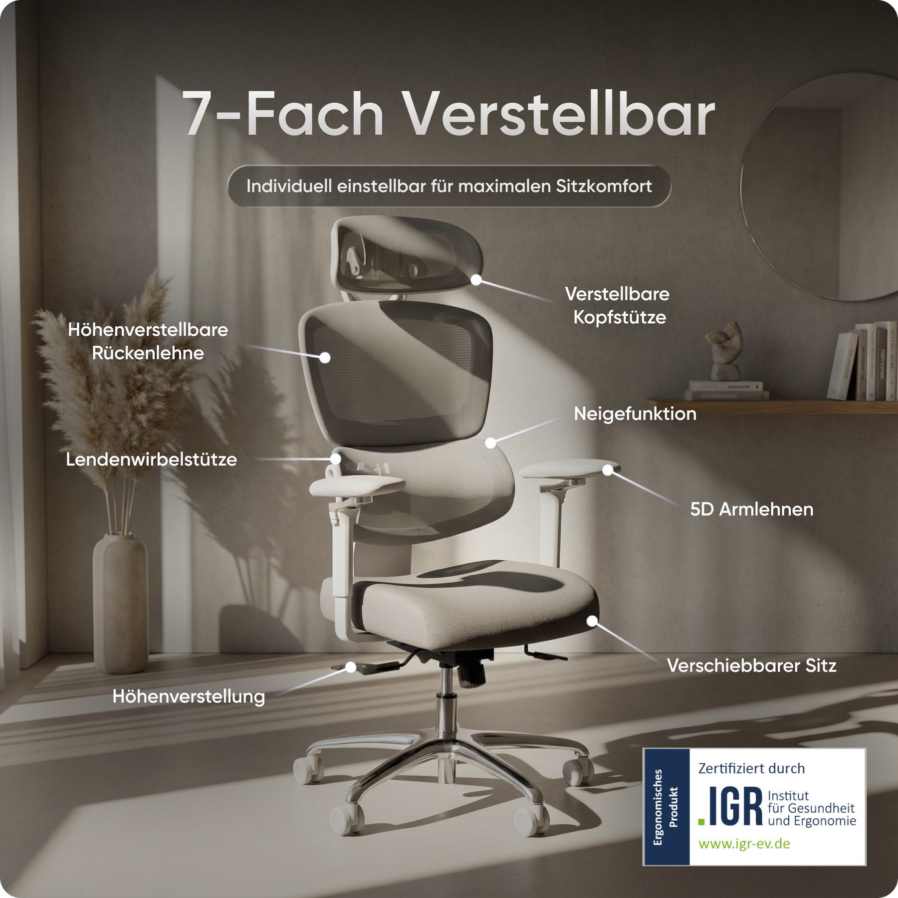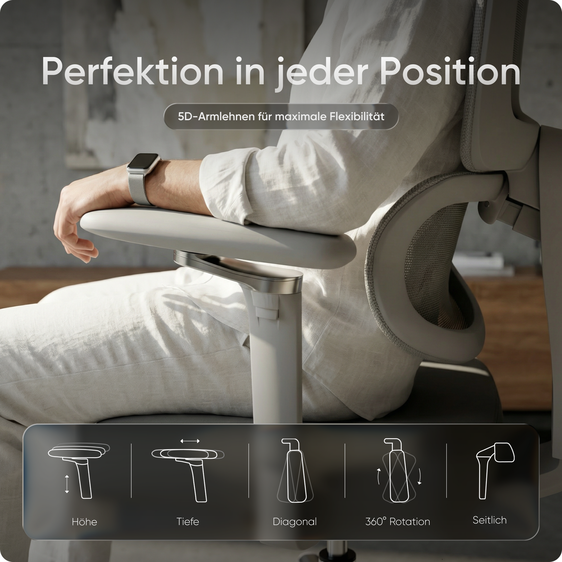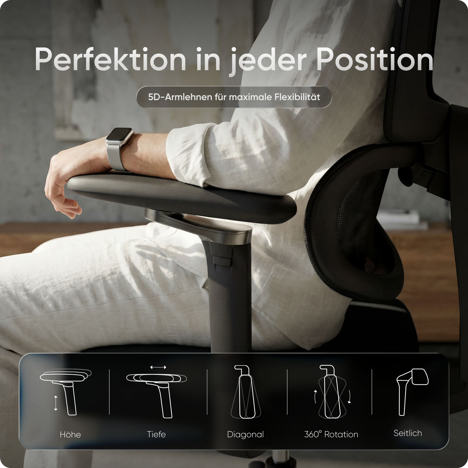 Die 5D-Armlehnen lassen sich in Höhe, Tiefe, Breite, Drehung und Neigung exakt anpassen, für entspannte Schultern, optimal gestützte Unterarme und ergonomische Unterstützung bei jeder Tätigkeit. Du hast jederzeit volle Kontrolle über deine Haltung.
