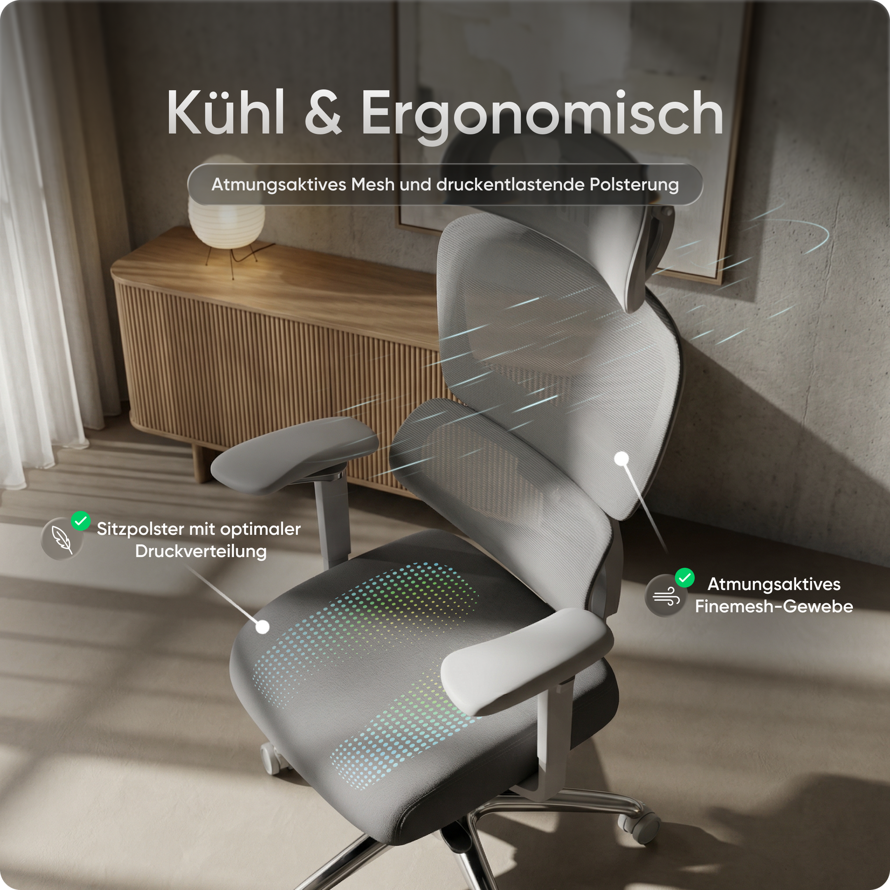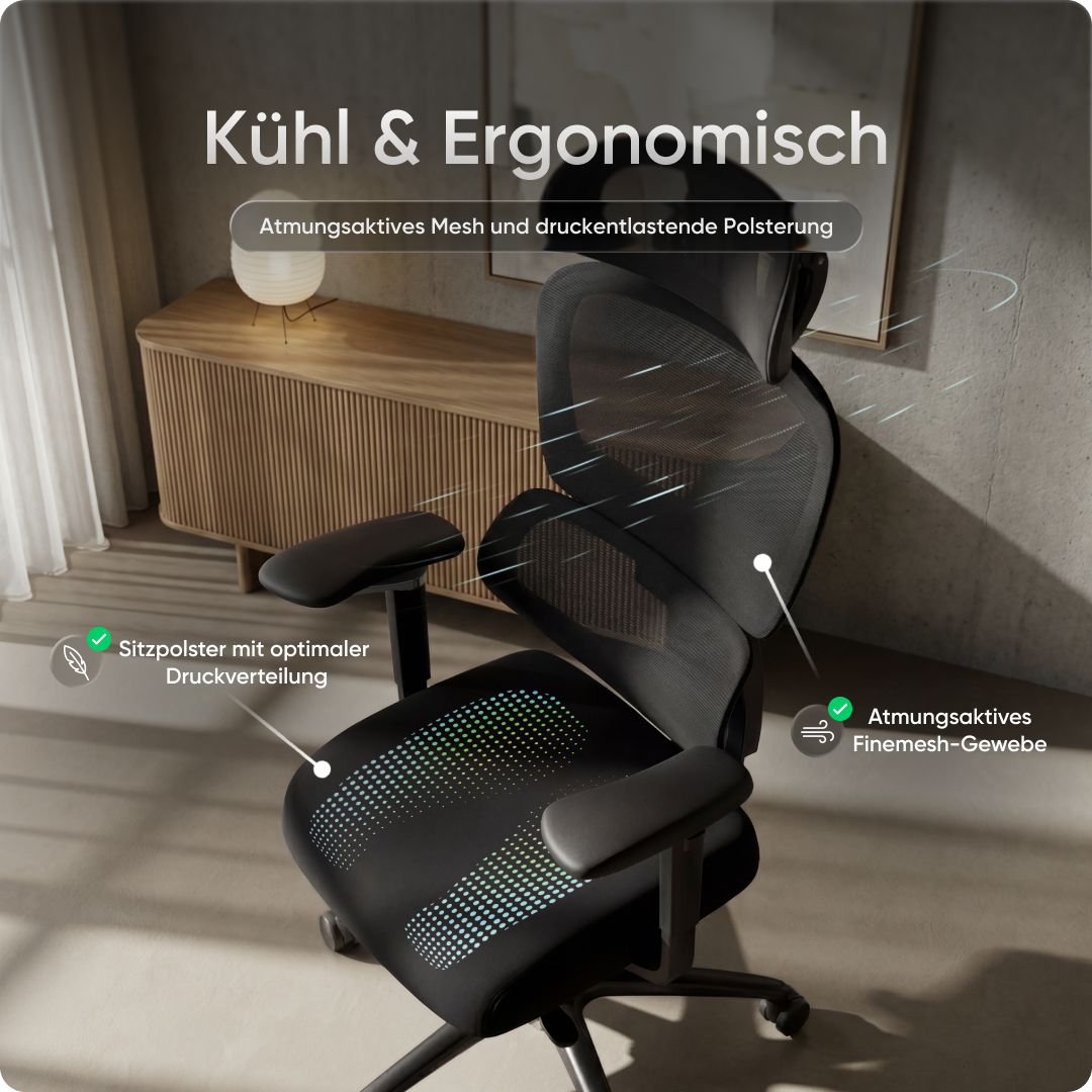 Das atmungsaktive Finemesh sorgt für konstante Luftzirkulation am Rücken, während das ergonomische Sitzpolster den Druck gleichmäßig verteilt. So bleibst du auch an langen Tagen cool, bequem und voll konzentriert, belastbar bis 150 kg.