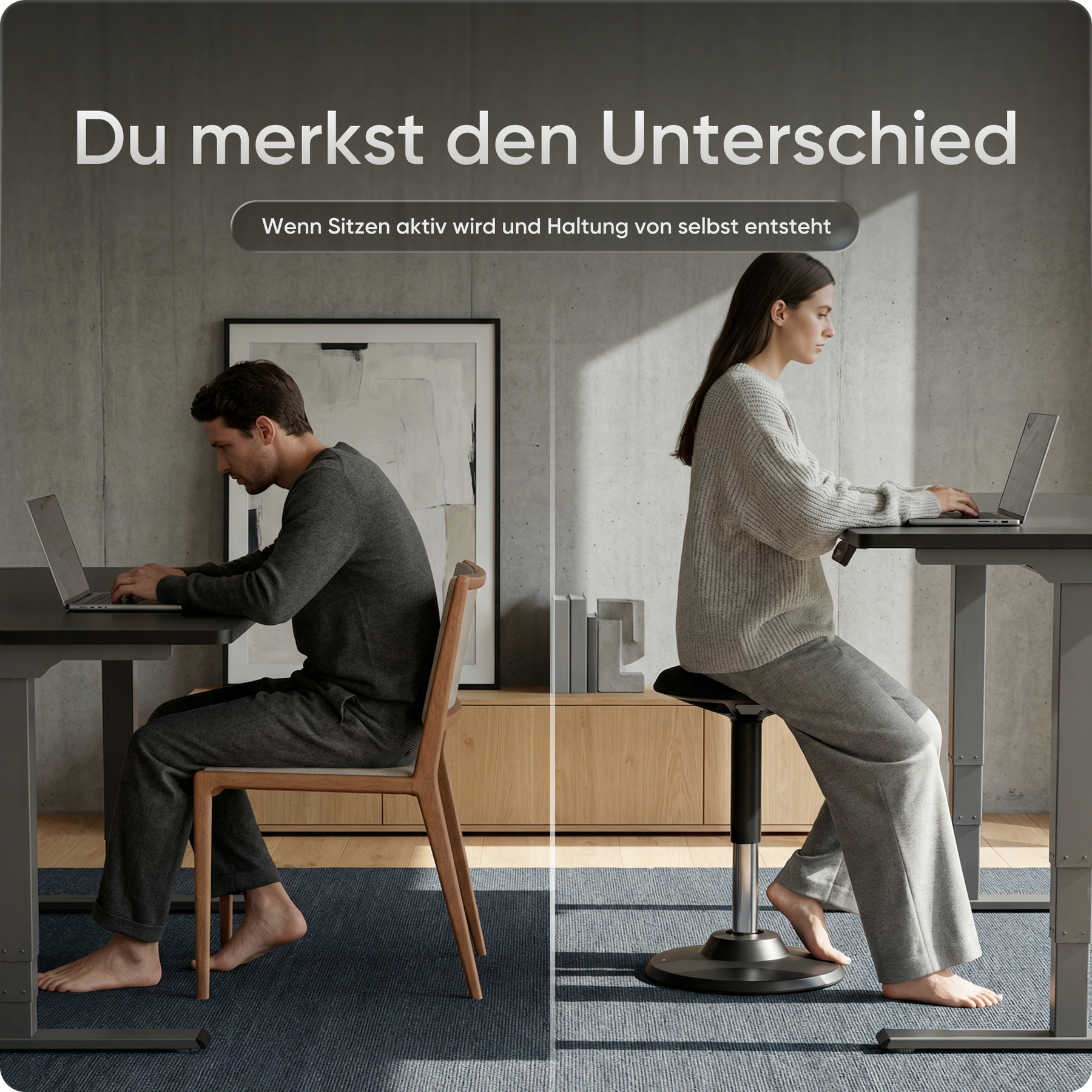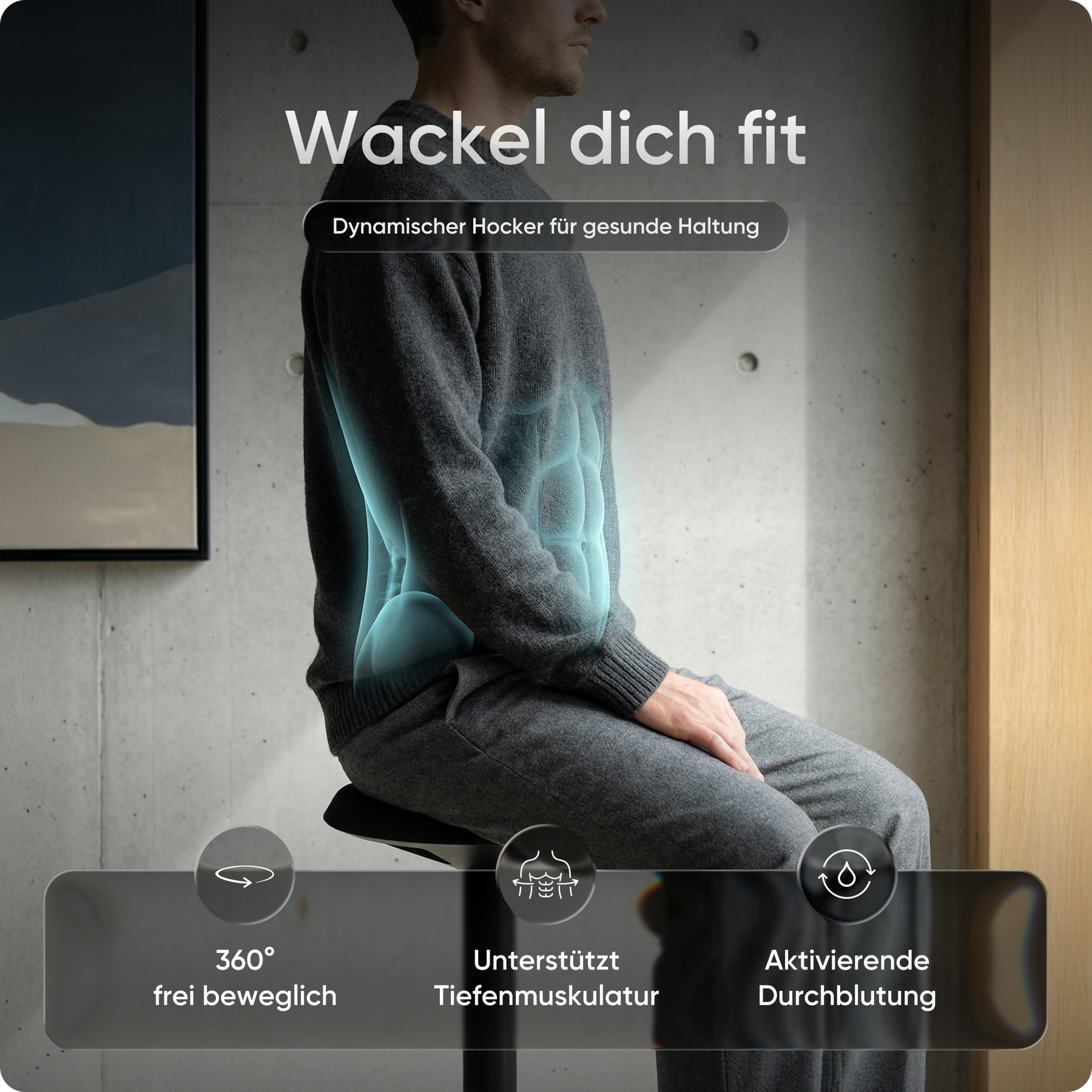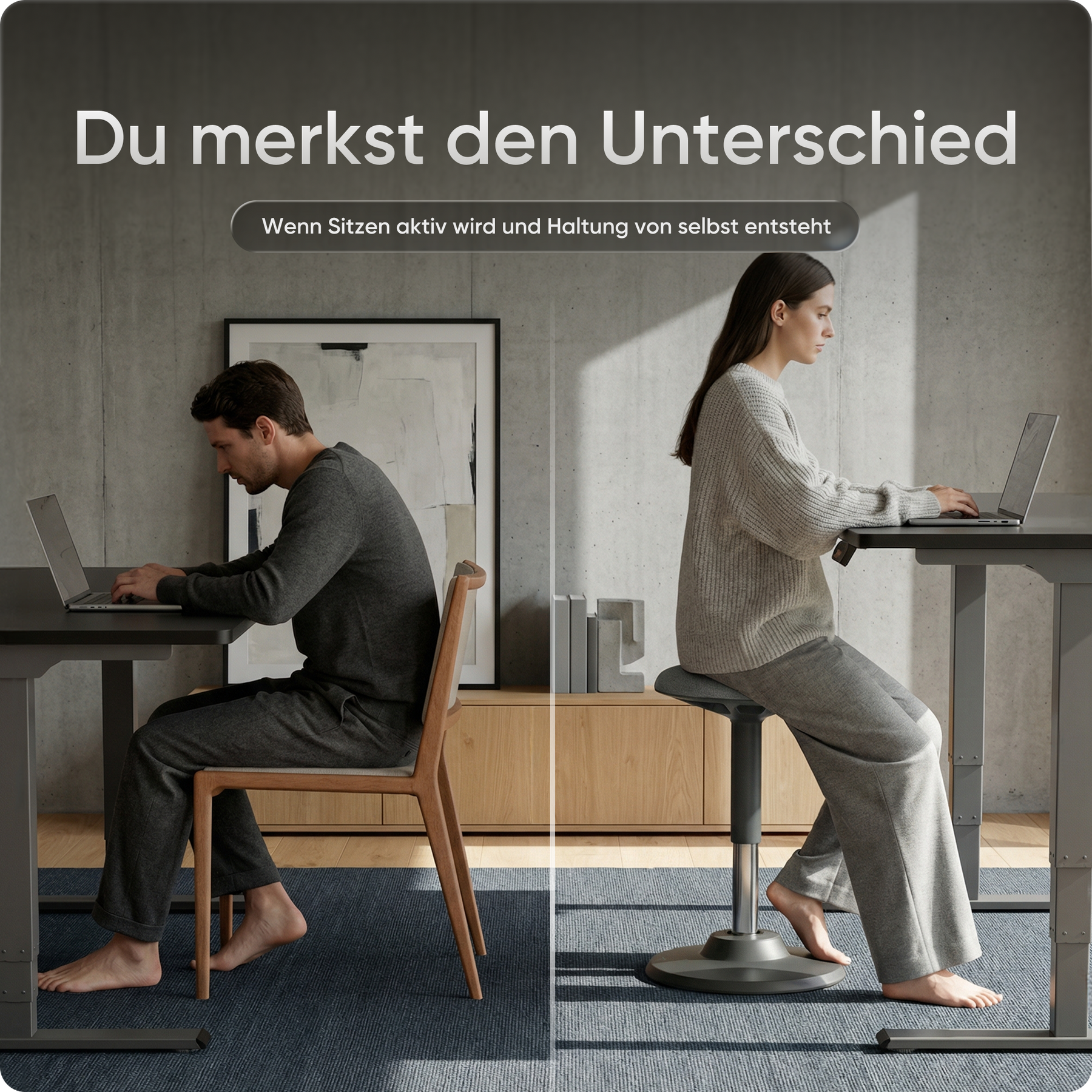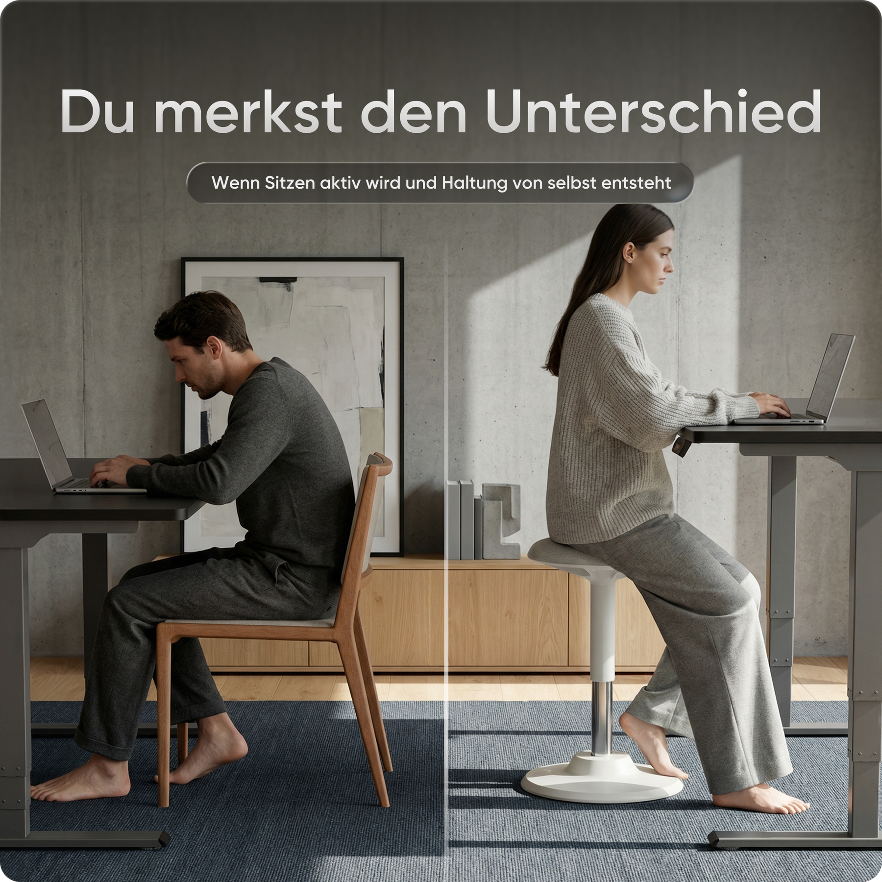 Die flexible Sitzfläche erlaubt Bewegungen in alle Richtungen, stärkt gezielt die Muskulatur und entlastet die Wirbelsäule. Empfohlen von Physiotherapeuten für gesundes, dynamisches Arbeiten.