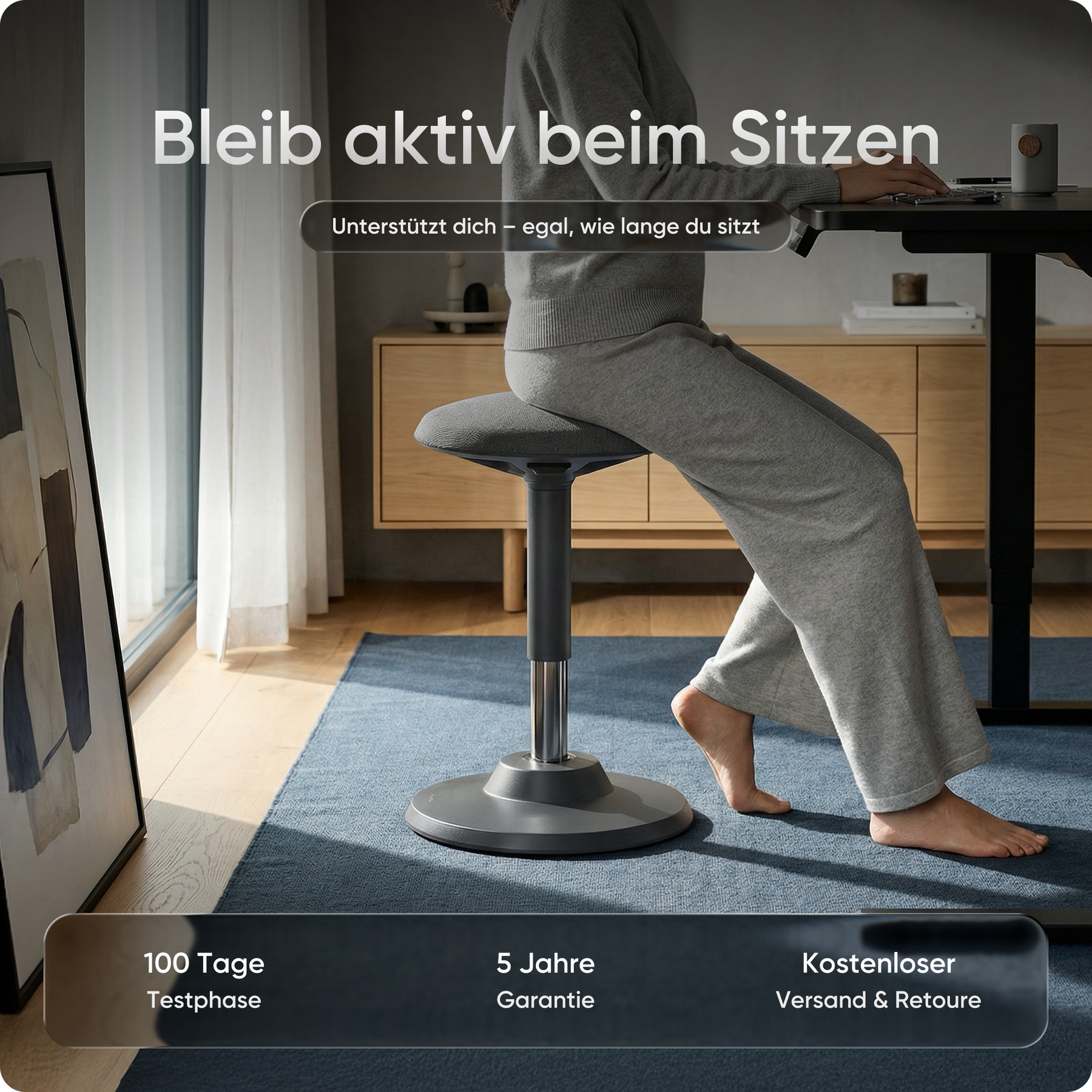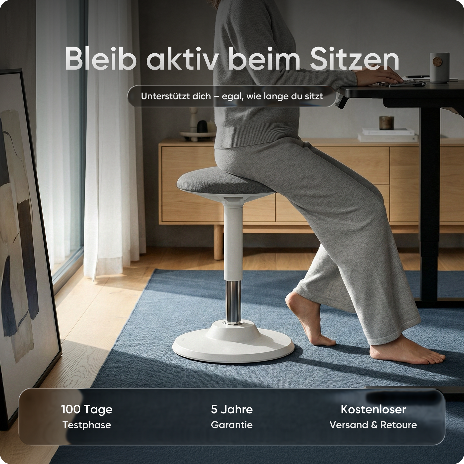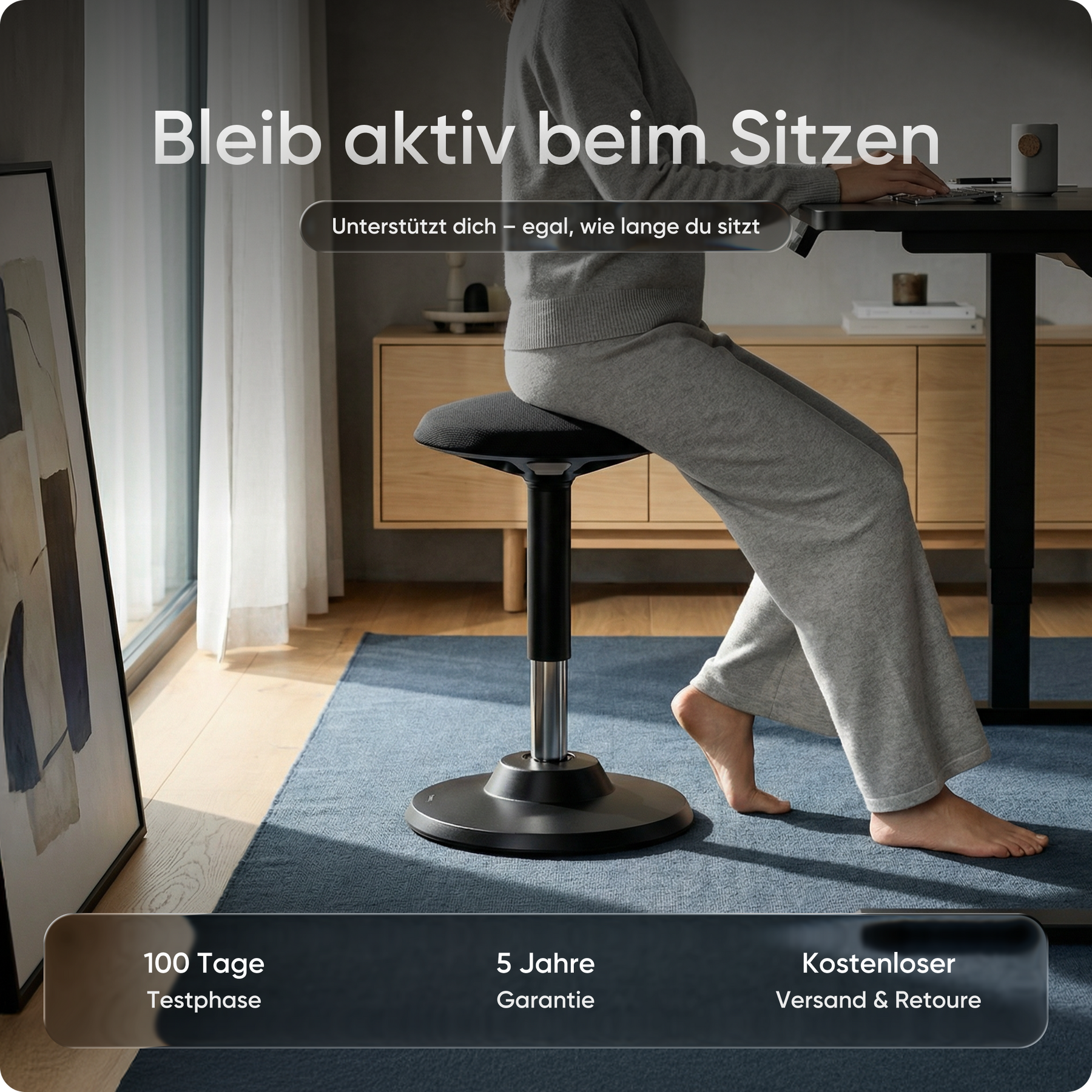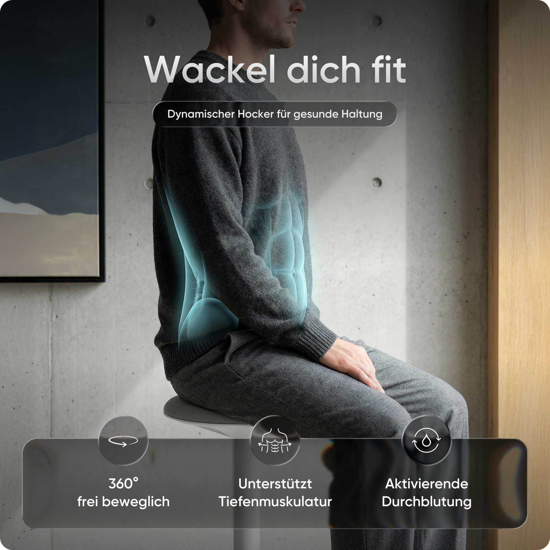 Die flexible Sitzfläche erlaubt Bewegungen in alle Richtungen, stärkt gezielt die Muskulatur und entlastet die Wirbelsäule. Empfohlen von Physiotherapeuten für gesundes, dynamisches Arbeiten.