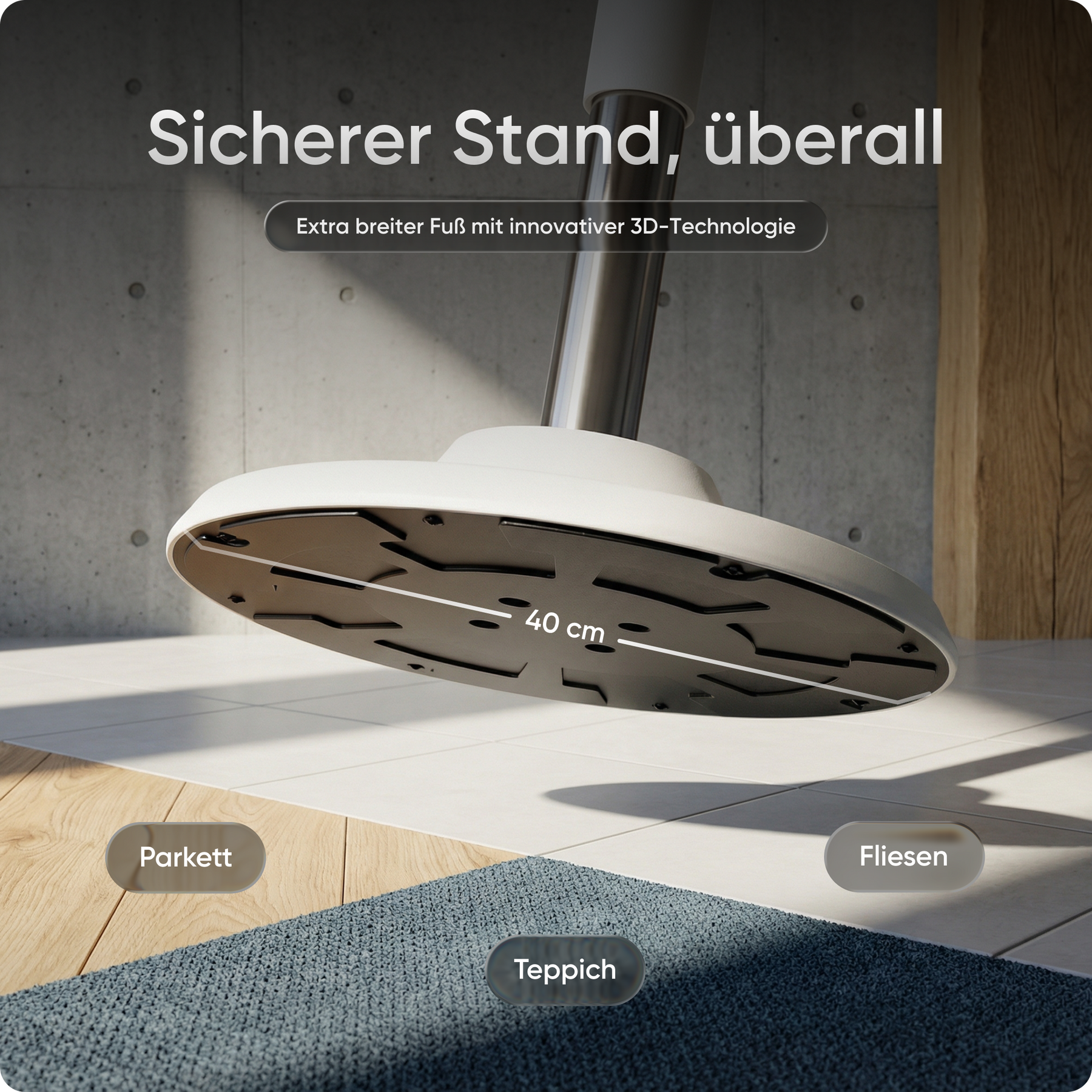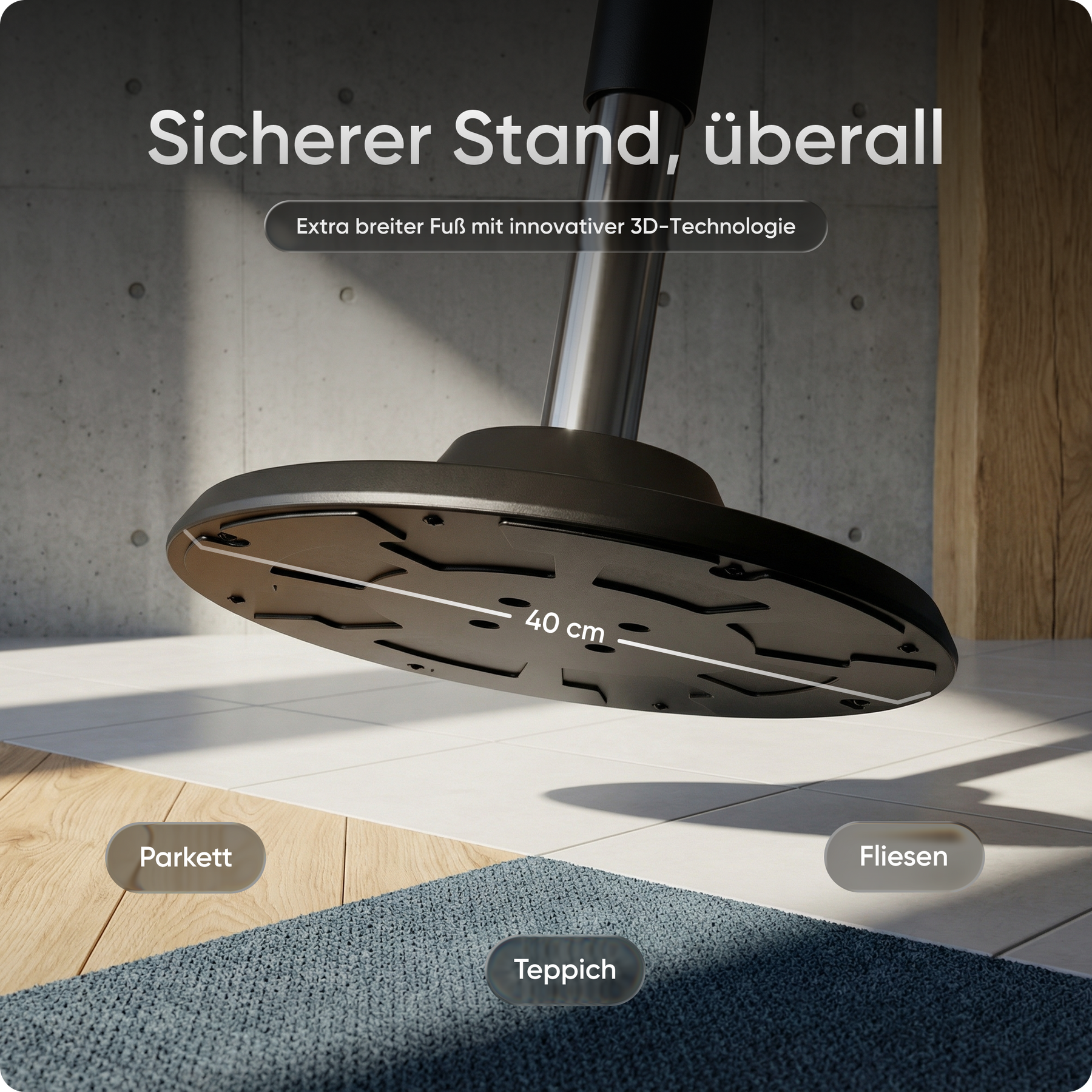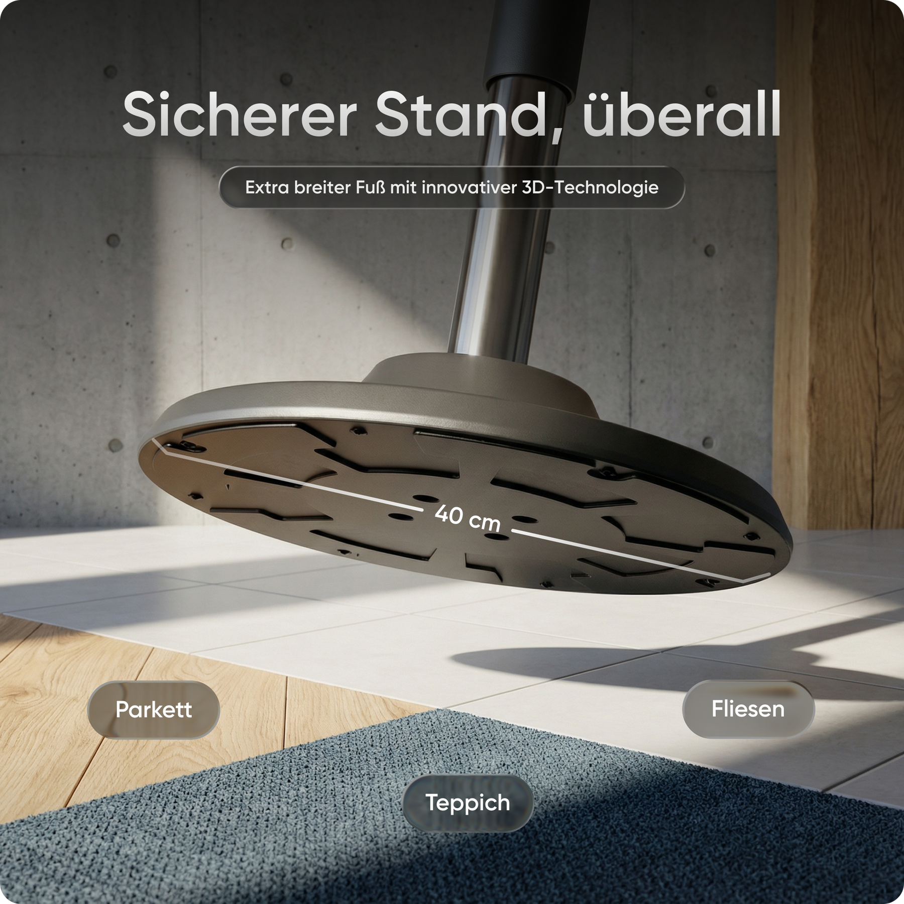 Die vergrößerte Anti-Rutsch-Fläche sorgt für sicheren Halt – selbst bei Schräglage oder Bewegung. Das robuste Gummimaterial funktioniert zuverlässig auf Teppich, Holz oder Beton und sorgt für langanhaltende Stabilität.