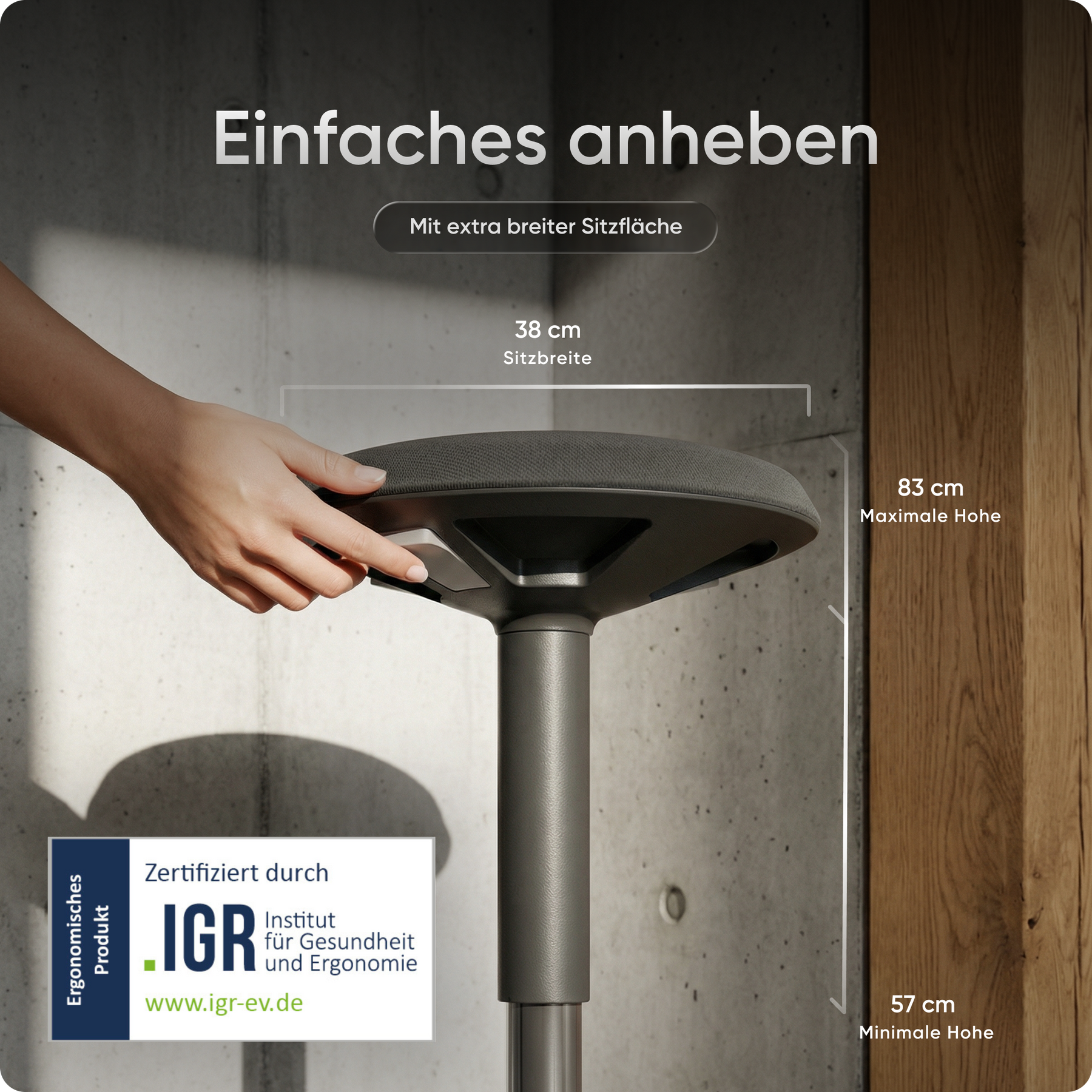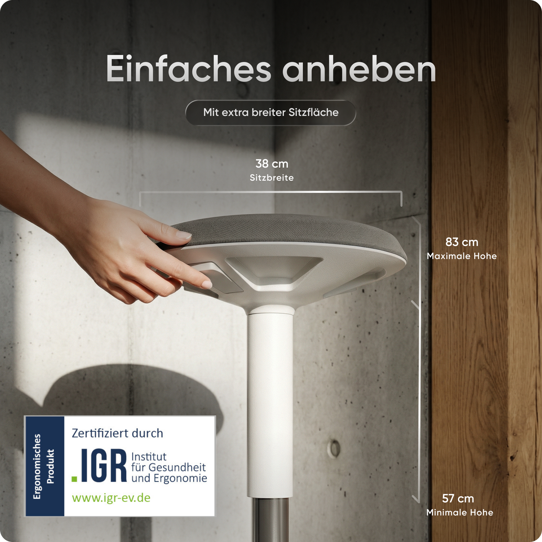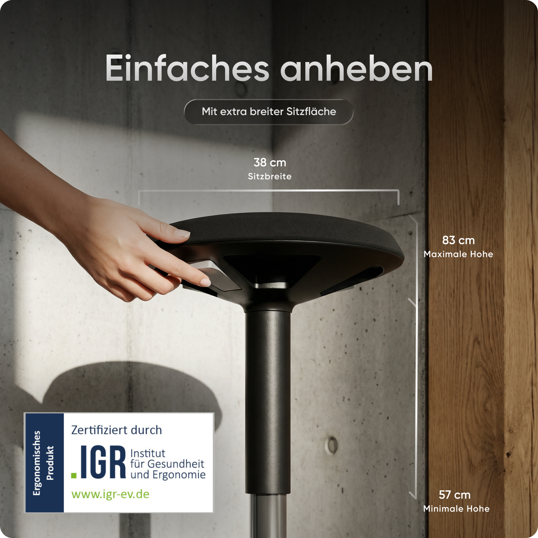 Die Sitzhöhe lässt sich bequem per Knopfdruck anpassen – schnell, intuitiv und ohne Aufwand. Dank integrierter Griffmulden lässt sich der Hocker zudem leicht anheben und flexibel in jedem Raum nutzen.