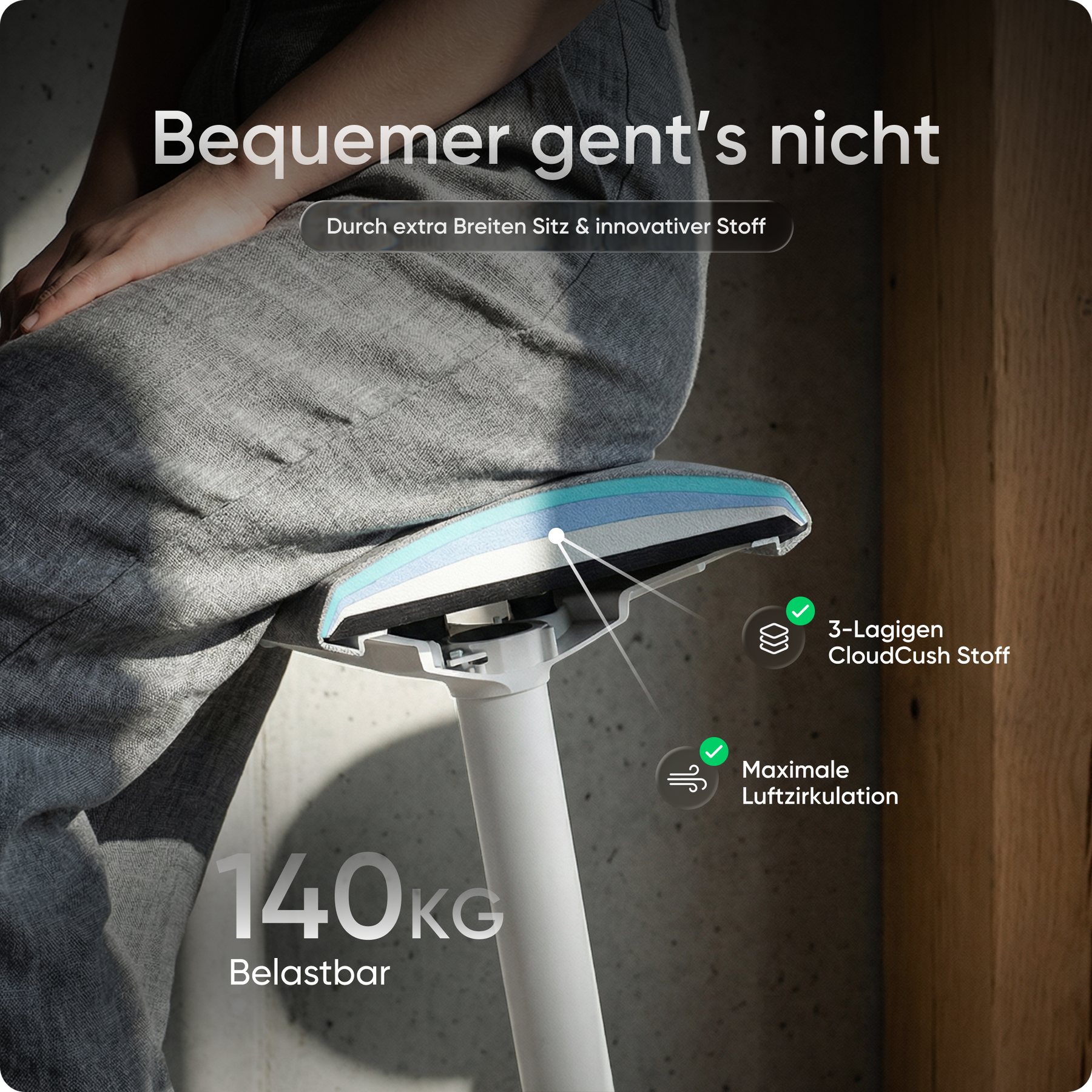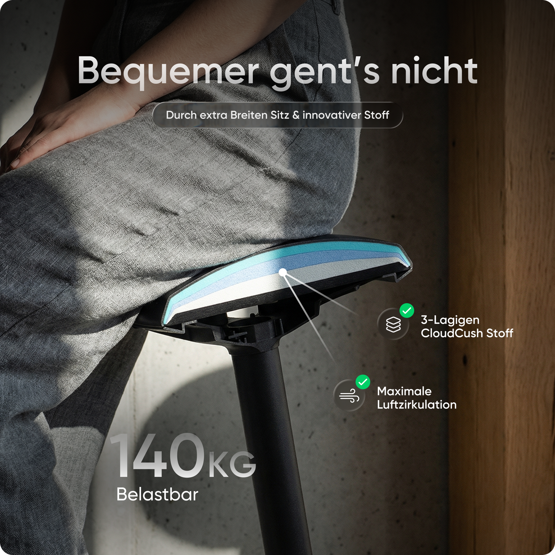Die ergonomische Form fördert eine aufrechte Haltung und vermeidet Druckstellen. Die dreilagige CushCloud-Polsterung aus Wolle und Nylon sorgt für spürbar mehr Komfort – auch bei langem Sitzen.